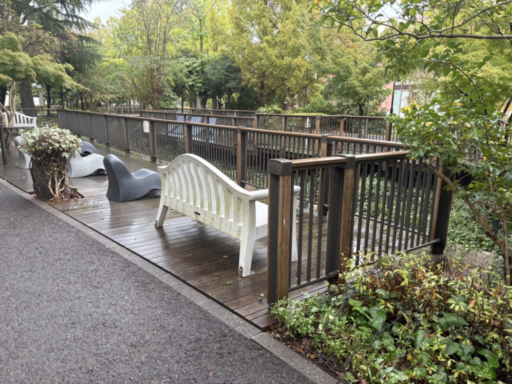 雨が降っていたため、座ることは叶わなかったが、晴れていたらとても気持ちがよさそうな場所であった。