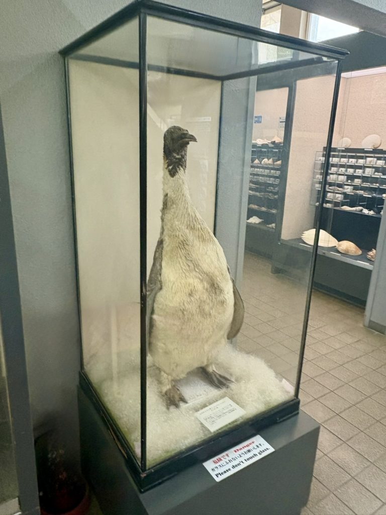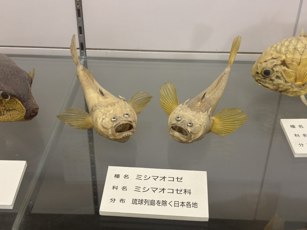 左に行くと展示室。志帆が驚いていたペンギンや、かわいいミニオコゼなど、多くの標本があった。ホルマリン漬け?されて展示されているものもあり、学校の生物室のような不気味さも感じた。