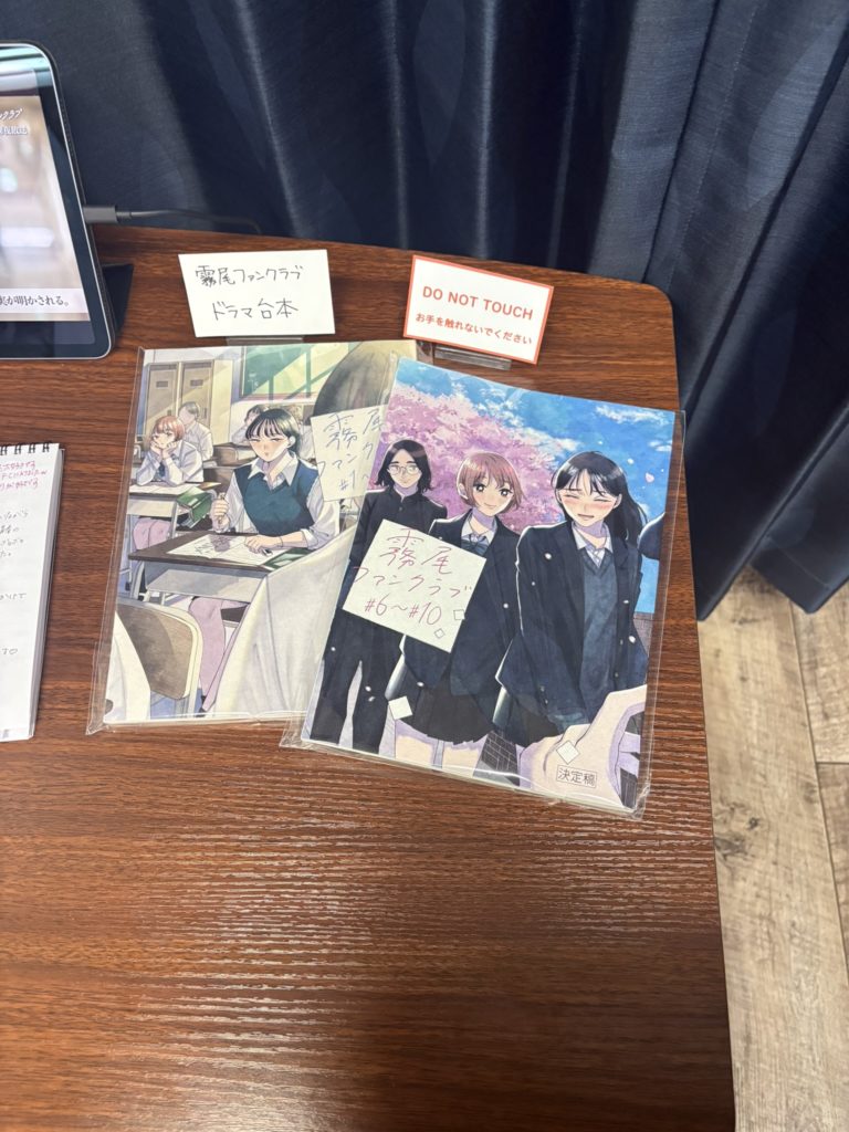 扉を開けると、すでにたくさんの人が入場していて。霧尾ファンのファンがの多さを実感。入口左手には、ドラマの映像と脚本が置かれていて、めちゃくちゃ中身を見たくなりましたが、「DO NOT TOUCH」の文字。よくよく考えたら、見てしまったらドラマのネタバレになっちゃいますよね(笑) 表紙からドラマが全10話あるっぽいことが分かり、原作のどこまで話が進むのかワクワクします。(後半の脚本の表紙が6巻のものが使われていたし、ドラマ5話の時点での展開から見ても、最後までやりそう?)