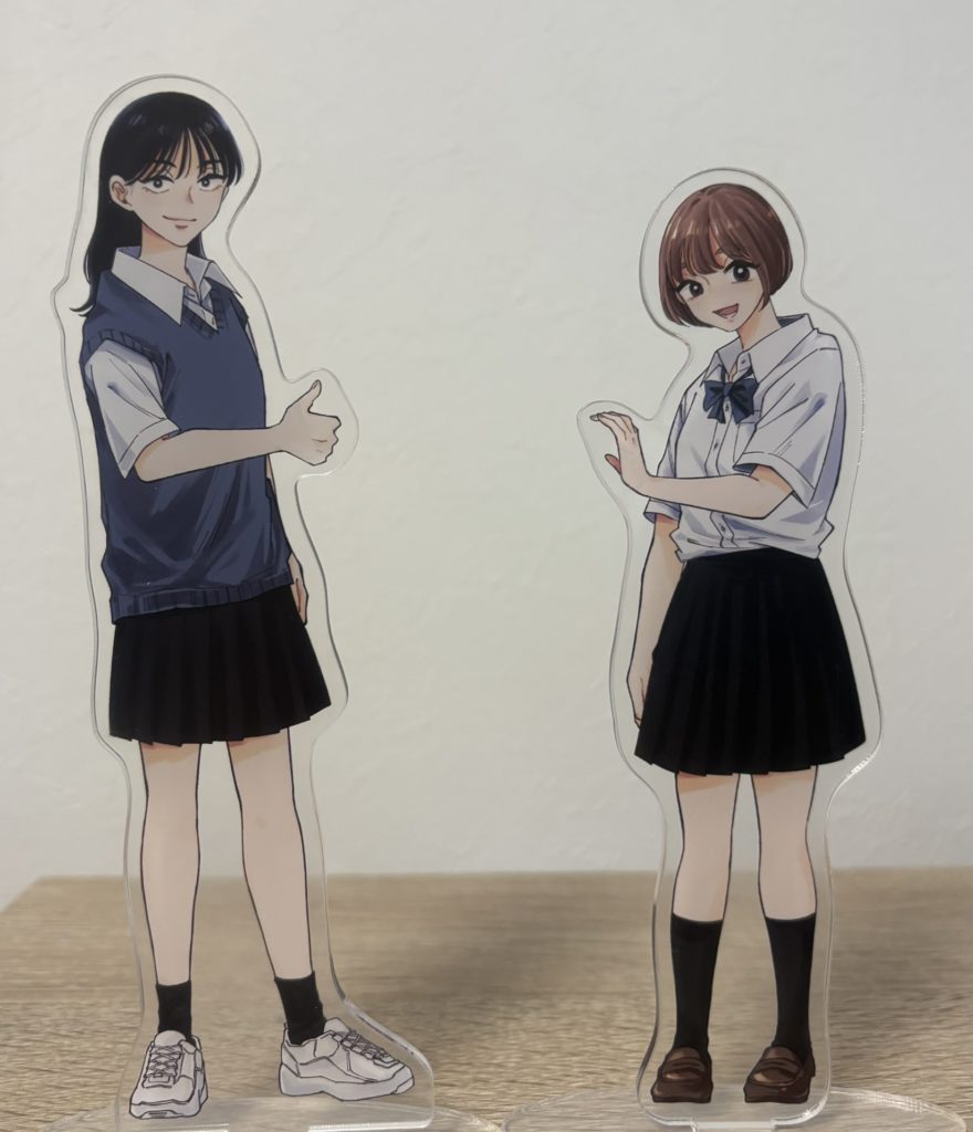 名場面シーンやキャラの1枚絵のあとには、藍美と波と一緒に写真を取れるスポットがありました。展示会オリジナルの描き下ろしイラストがありましたが、この2人の表情がとても良いですよね。グッズは最初から狙っていた、波のキモい英語シャツと、2人のアクスタを買いました。8000円を超えて、大福ステッカーシールも4種類コンプできました。